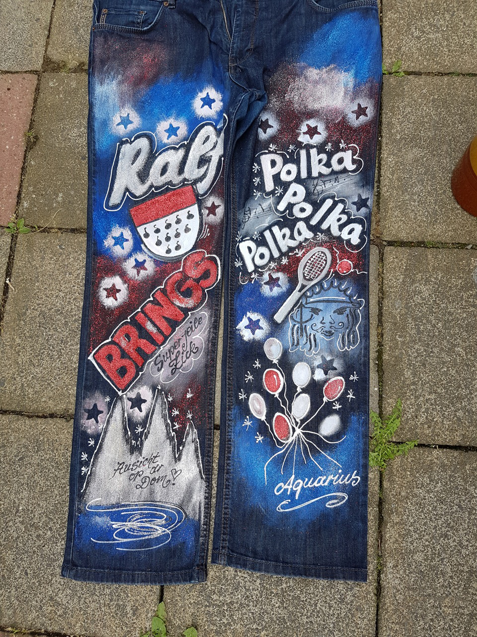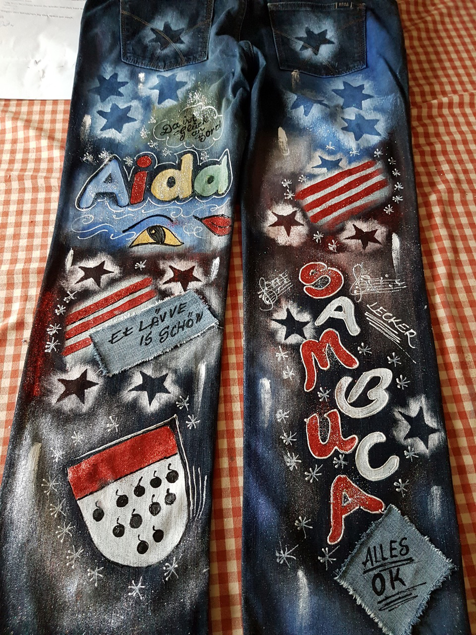 Du magst keine Jeanshosen? Kein Problem Ute bemalt alles, wo die Farbe drauf haftet.
