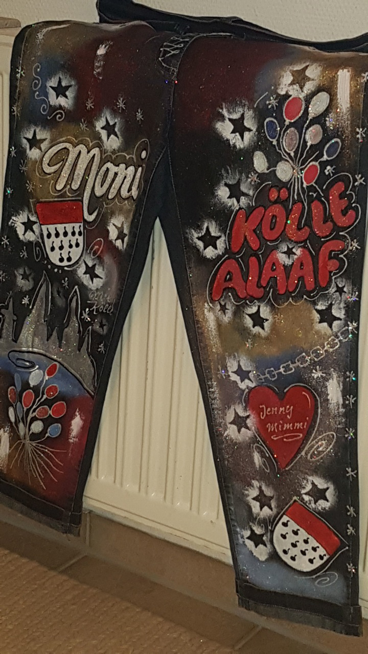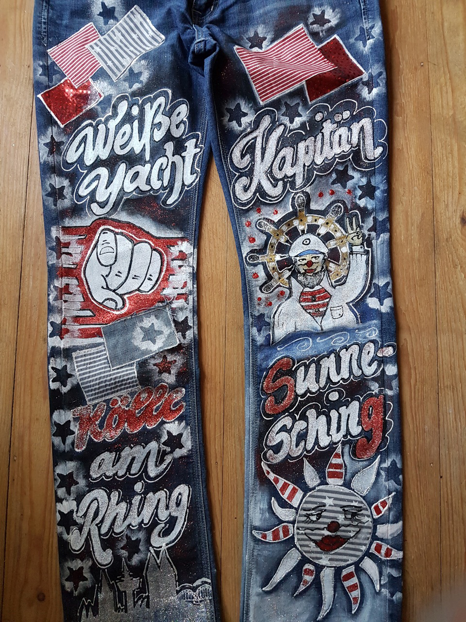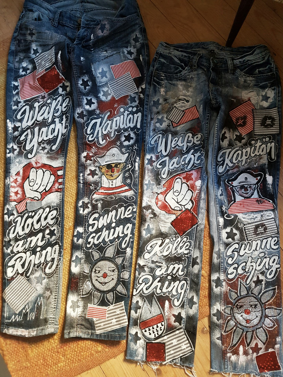 Alle Jeanshosen sind individuell und in stundenvoller Handarbeit handbemalt. Keine Jeanshose gleicht der anderen. Die Preise richten sich nach Aufwendigkeit, Wunschmotiven und Anzahl der Strass-Steine. Sichere dir jetzt dein Unikat für die nächste Karnevalssession.