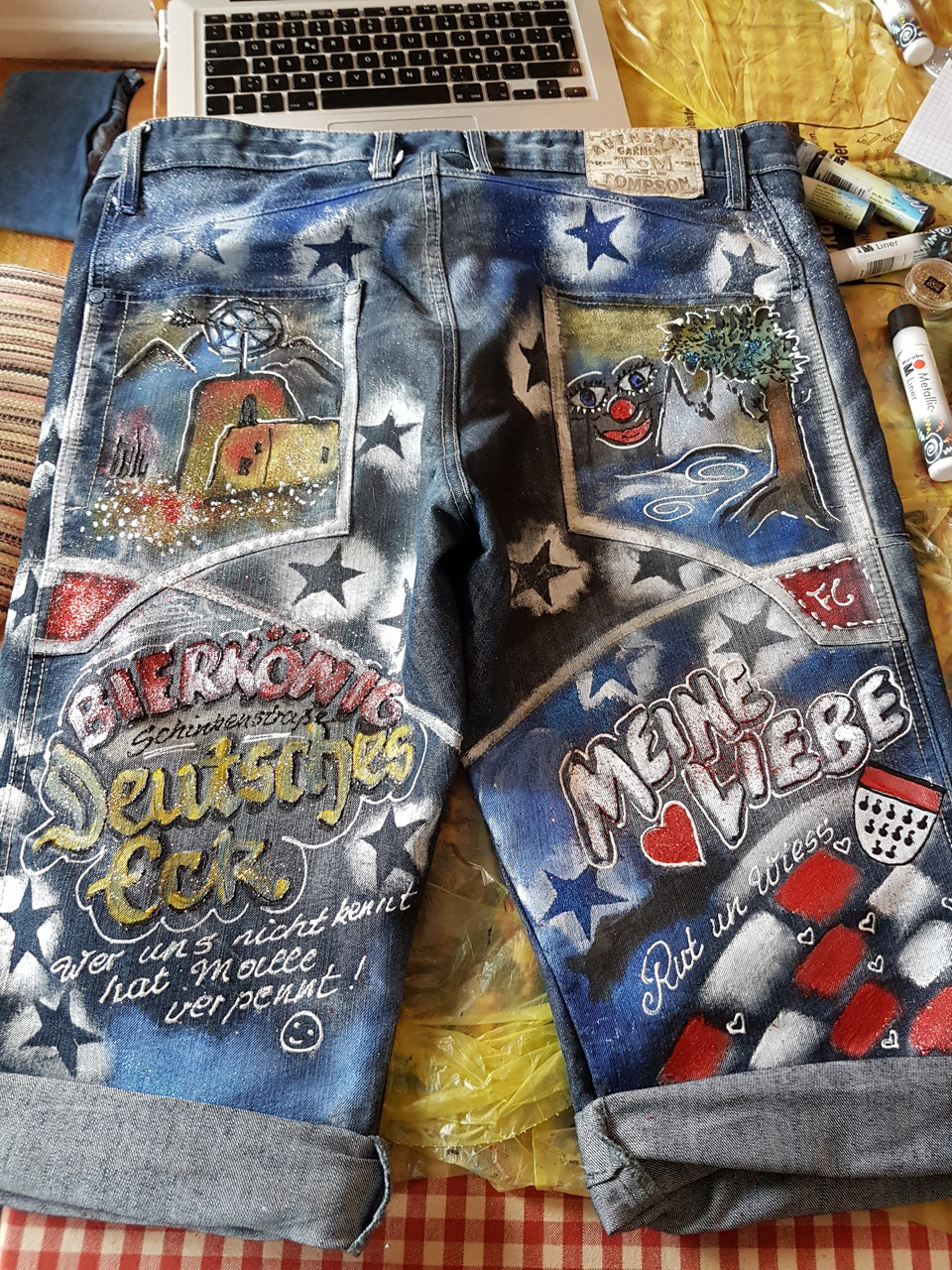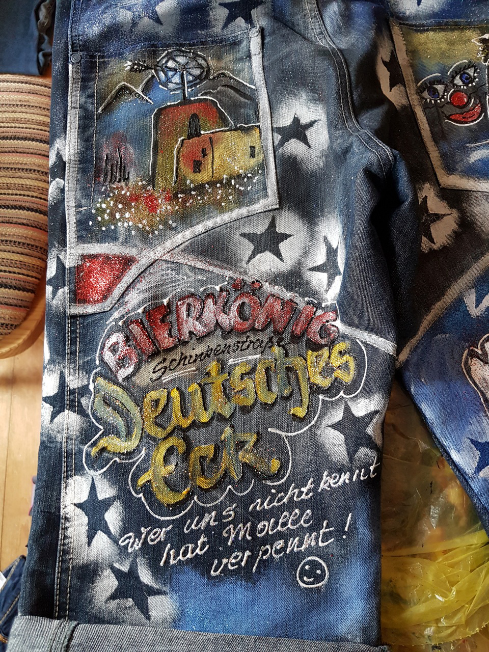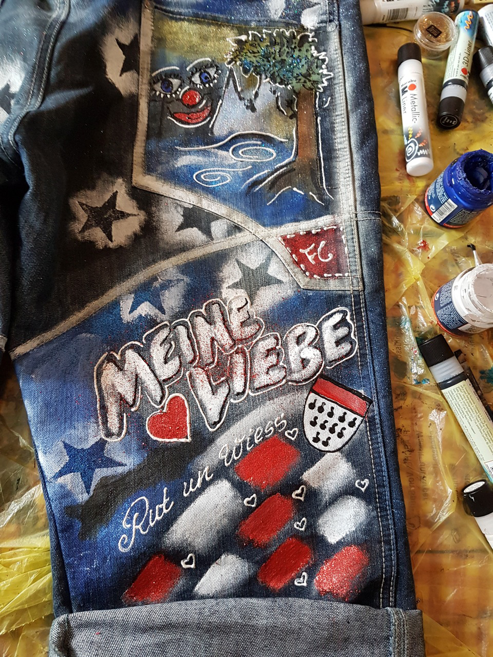 Alle Jeanshosen sind individuell und in stundenvoller Handarbeit handbemalt. Keine Jeanshose gleicht der anderen. Die Preise richten sich nach Aufwendigkeit, Wunschmotiven und Anzahl der Strass-Steine. Sichere dir jetzt dein Unikat für die nächste Karnevalssession.