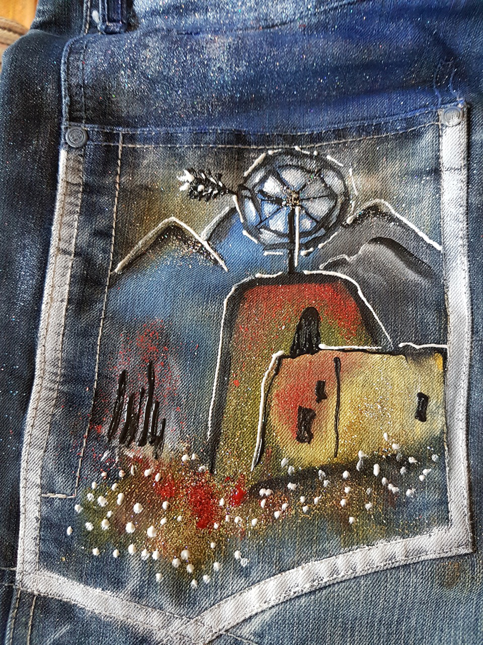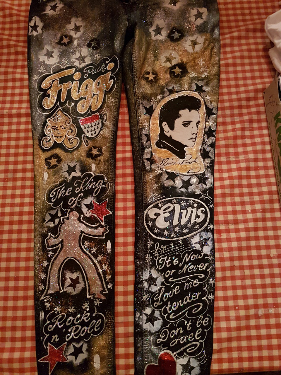 Wir haben hier einige Beispiele unserer handbemalten Jeanshosen für euch zusammengestellt.